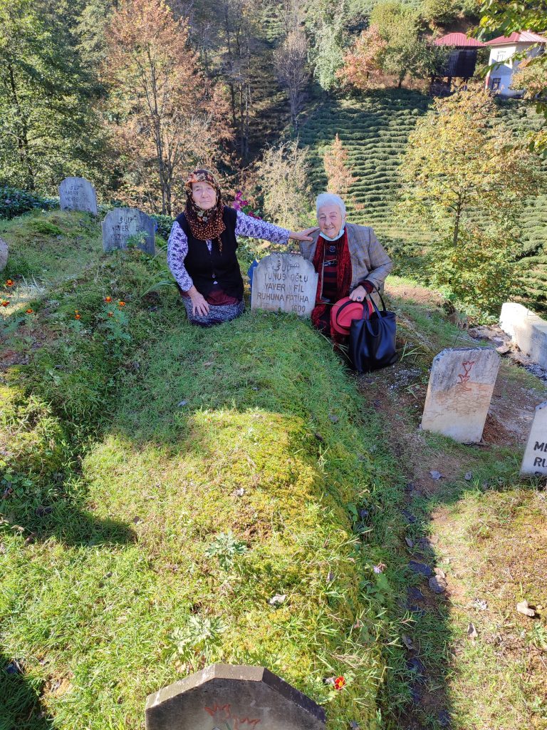 Jandarma eşliğinde köylülerle görüşmemizi bitirince resmi araçla yukarı mezarlığa çıktık. Vardığımız tepede  Gazi Yaver dedenin gelini Nazmiye teyzeyle karşılaştık ve birlikte mezarlığa gittik. Bu güzel teyzemizden Allah razı olsun, bütün kabristanlığı pırıl pırıl temiz tutuyor. Çok heyecanlandı, duygulandı, “Kaynatamdı” dedi ağladı, sonra komutan Mehmet Bey bize fotoğraf çekti.