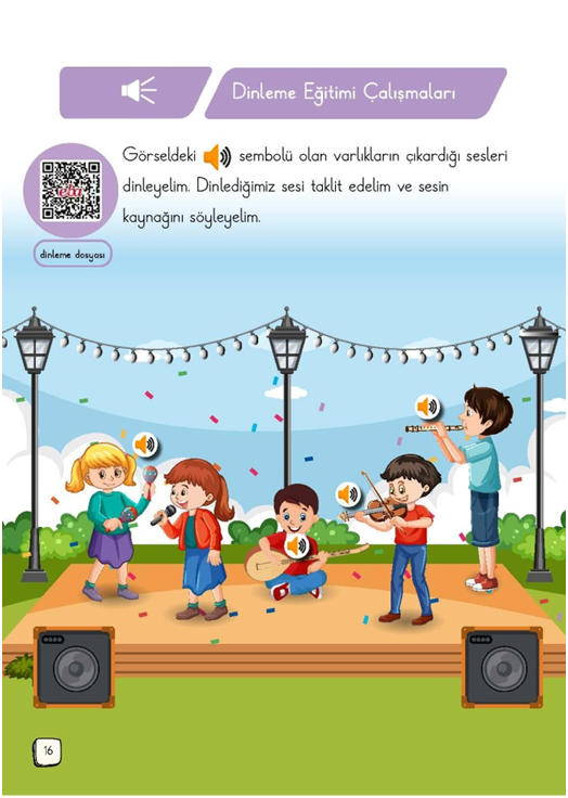 16.sayfadaki kare kodlu Dinleme Eğitimi görselinde müzik aletleri için “varlık” denilmekte ve dinletilen ezgiyi taklit etmeleri istenmektedir. Birincisi, çalgılar varlık değildir, el yapımı eşyadır. İkincisi keman ve bağlamanın çaldığı ezgiyi bu yaşta taklit edemezler. Mikrofonun sesi yoktur. Marakas ise ezgi çalgısı değil ritim çalgısıdır, sesi taklit edilemez, ritmine el çırparak katılması istenir.